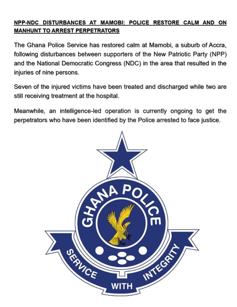 The Police have restored calm at Mamobi, a suburb of Accra, following disturbances between supporters of the New Patriotic Party and the National Democratic Congress, resulting in the injuries of nine people.