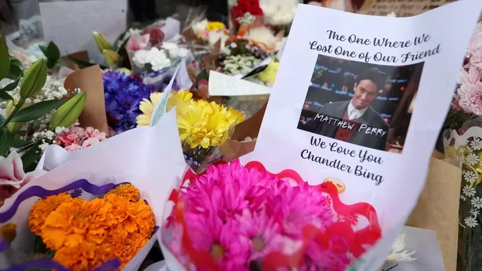 Fans gathered outside the Friends apartment building outside New York to leave floral tributes.