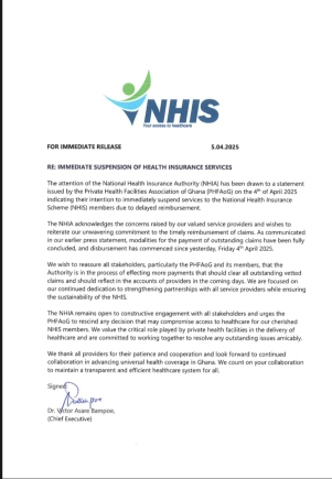 The National Health Insurance Authority (NHIA) has called on the Private Health Facilities Association of Ghana (PHFAoG) to reconsider its decision to suspend services to National Health Insurance Scheme (NHIS) cardholders over delayed claim reimbursements.