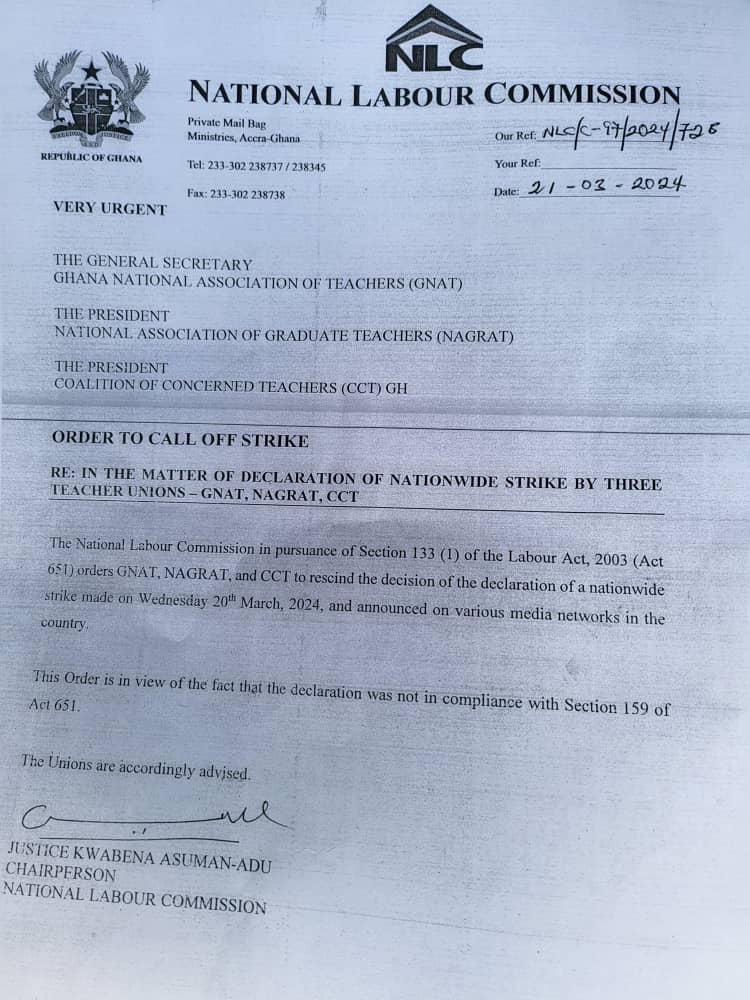 The National Labour Commission (NLC), has ordered the Ghana National Association of Teachers (GNAT), National Association of Graduate Teachers (NAGRAT), and Coalition of Concerned Teachers (CCT), to call off their nationwide strike declared on Wednesday, March 20, 2024.