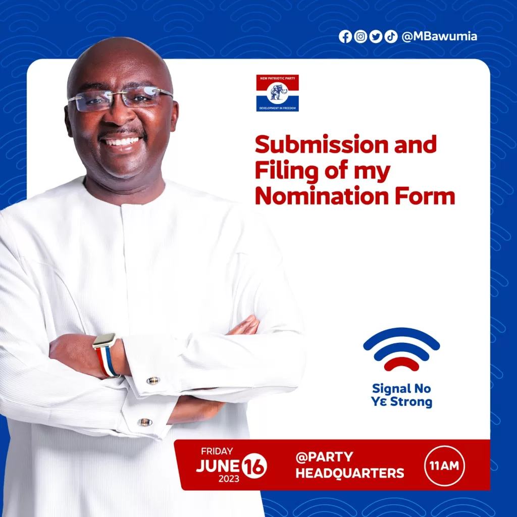 Vice President Mahamudu Bawumia will on Friday, June 16, 2023, file his nomination forms to contest the New Patriotic Party’s Presidential Primaries.