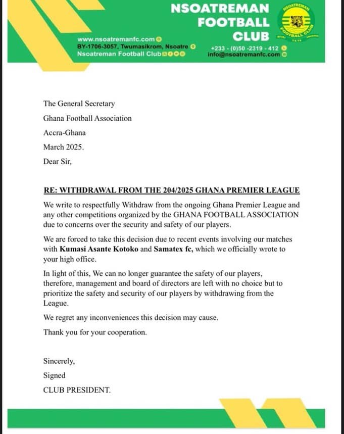 Nsoatreman FC has announced its decision to withdraw from the Ghana Premier League, citing recent incidents that have compromised the safety of their players and officials.
