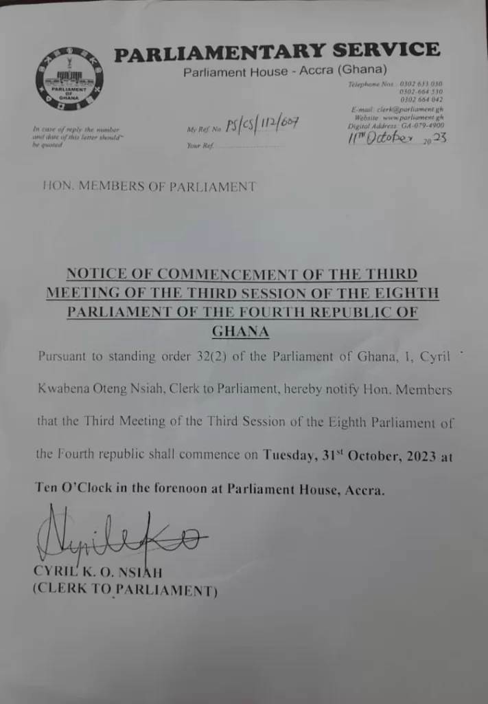 Kwabena Oteng Nsiah issued a public notice to MPs dated 11th October, 2023 summoning them to resume sitting for Third Meeting of the Third Session of the Eighth Parliament of the Fourth republic at Ten O’clock in the forenoon at Parliament House, Accra.