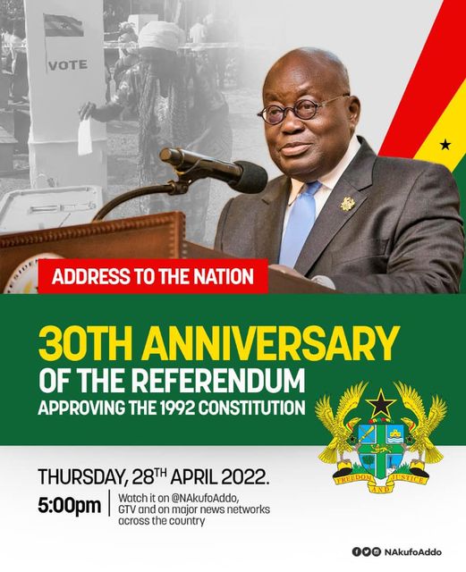 At 5pm today, April 28, 2022, the President, Nana Akufo-Addo will address the nation on the 30th Anniversary of the jj approving the 1992 Constitution.