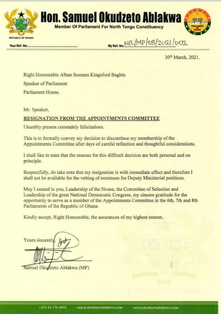 The Member of Parliament for North Tongu, Samuel Okudzeto Ablakwa has resigned from the Appointments Committee of Parliament with immediate effect.