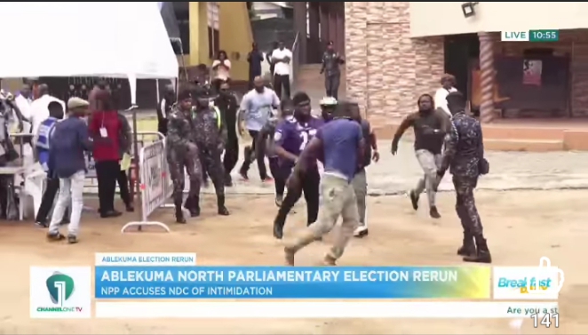 Chaos erupted at Ablekuma North during the parliamentary rerun when a group of unidentified macho men stormed the St. Peter’s Polling Station, attacked political figures, and disrupted the voting process while the election was underway.