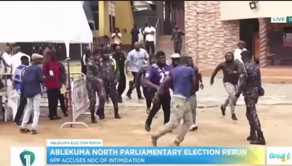 Chaos erupted at Ablekuma North during the parliamentary rerun when a group of unidentified macho men stormed the St. Peter’s Polling Station, attacked political figures, and disrupted the voting process while the election was underway.