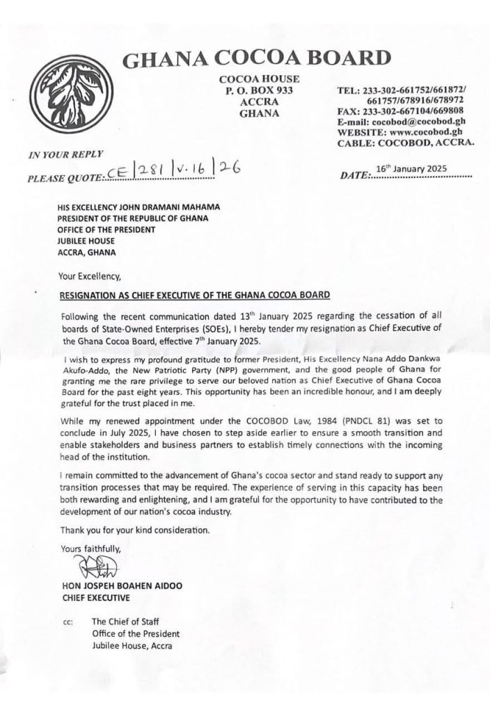 Joseph Boahen Aidoo has officially resigned from his position as Chief Executive of the Ghana Cocoa Board (COCOBOD).