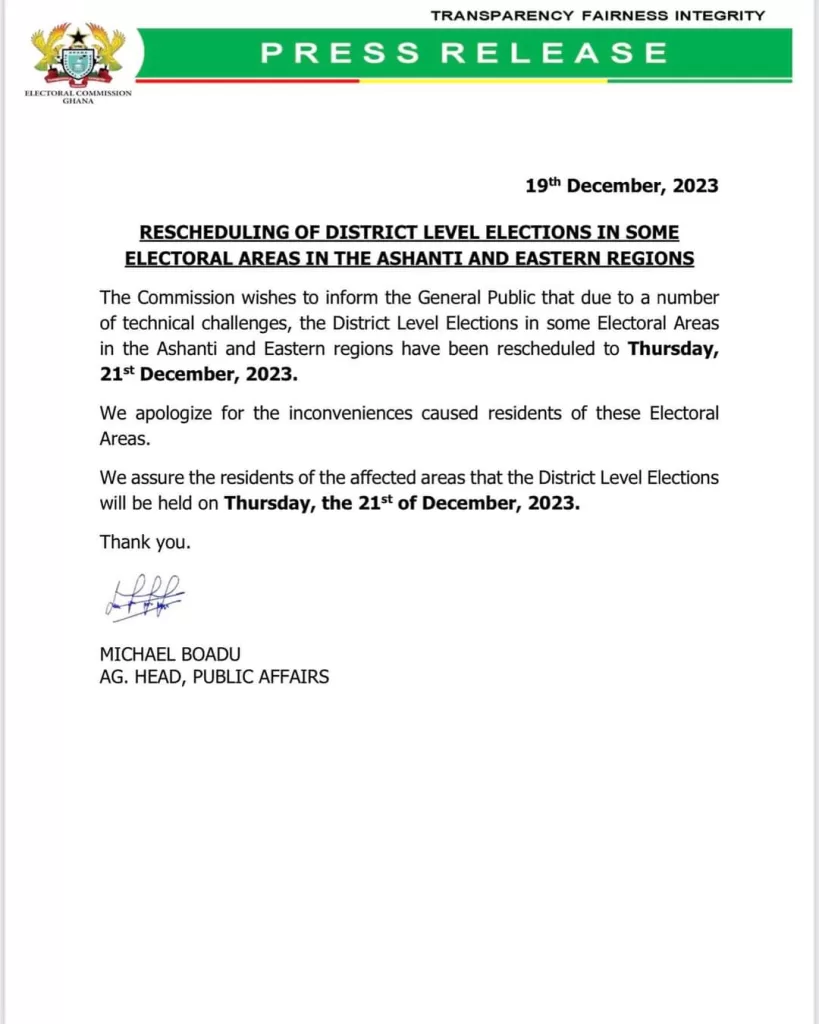 The Electoral Commission (EC), has rescheduled the district-level elections in some electoral areas in the Ashanti and Eastern Regions.