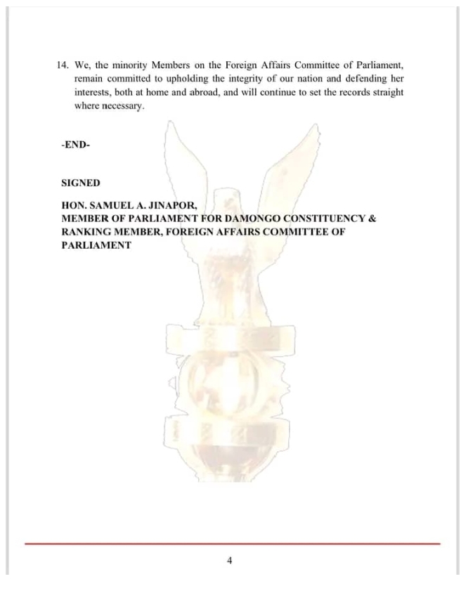 “We, the minority Members on the Foreign Affairs Committee of Parliament, remain committed to upholding the integrity of our nation and defending her interests, both at home and abroad, and will continue to set the records straight where necessary.”