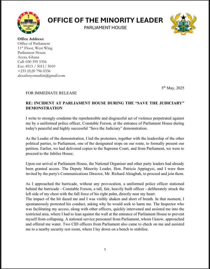 The Minority Leader in Parliament, Hon. Alexander Afenyo-Markin, has strongly condemned what he describes as a “deliberate and disgraceful act of violence” perpetrated against him by a police officer during the “Save the Judiciary” demonstration held on Monday, May 5, 2025.