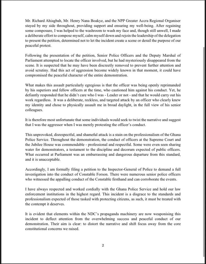 “As the leader of the demonstration, I was guiding protesters, along with other political party leaders, to present our petition to Parliament,” Afenyo-Markin stated. “While attempting to join other party officials who had already been granted access, I was attacked unprovoked by Constable Forson, who knew exactly who I was.”