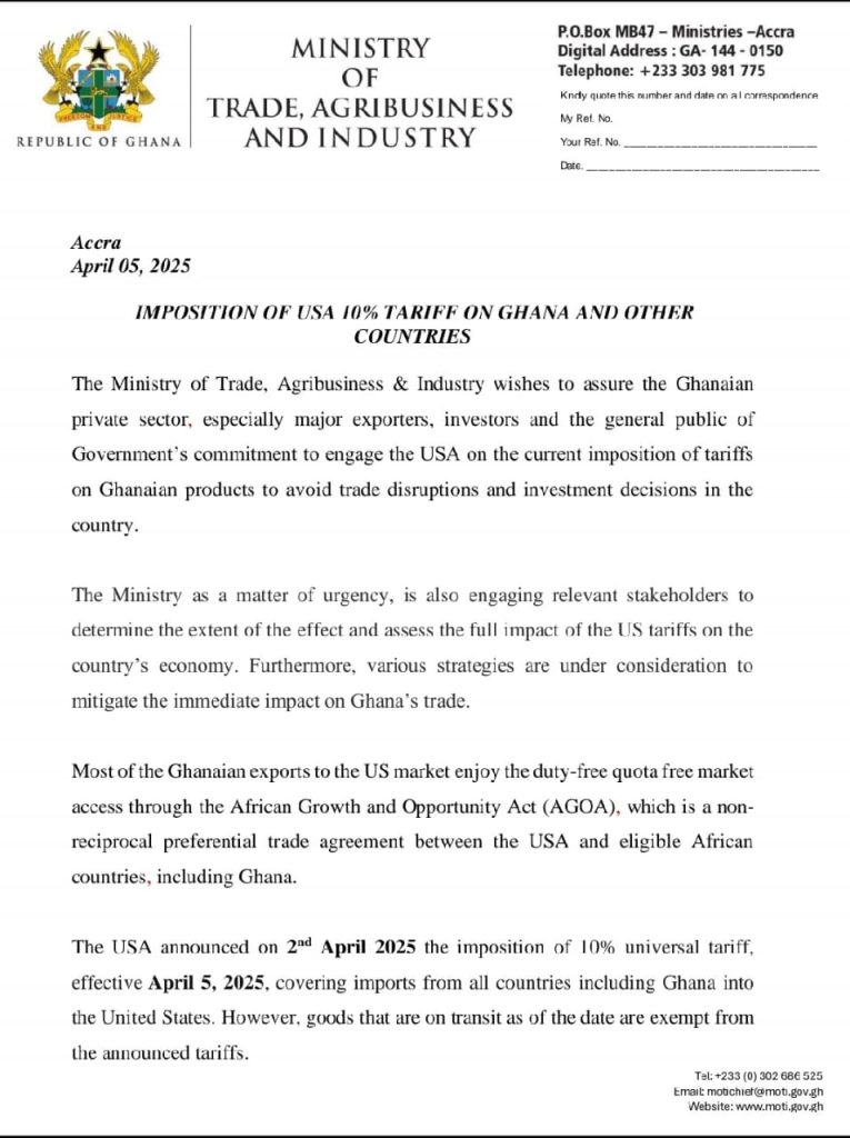 The Government of Ghana has assured its private sector of swift action following the United States’ imposition of a 10% universal tariff on imports, including Ghanaian products, effective April 5, 2025. This move ends Ghana’s duty-free access under the African Growth and Opportunity Act (AGOA), posing significant challenges for exporters of key goods such as apparel, cocoa derivatives, gold jewelry, and shea butter. The tariffs, announced by the U.S. on April 2, 2025, are part of broader measures under the International Emergency Economic Powers Act (IEEPA) to address trade deficits and national security concerns. Goods already in transit before April 5 are exempt, while reciprocal tariffs ranging from 11% to 50% will take effect on April 9 for over 50 countries. Notably, certain products—including copper, pharmaceuticals, and critical minerals—are exempt from the tariffs, but Ghana’s priority exports are not among them.