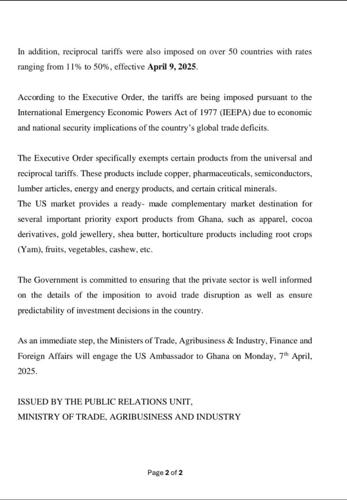 The government has pledged to keep stakeholders informed and prioritize protective measures to safeguard Ghana’s trade interests. Further updates will follow the April 7 diplomatic engagement. The Ministry plans to explore alternative markets and accelerate regional trade partnerships under the African Continental Free Trade Area (AfCFTA) to cushion the blow.