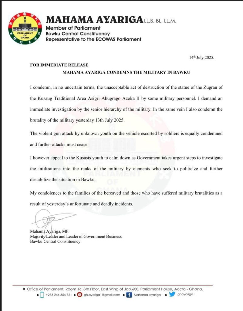 The Member of Parliament for Bawku Central and the Majority leader in Parliament, Mahama Ayariga, has issued a condemnation of the Ghana Armed Forces following a violent incident in Bawku on July 13, 2025.