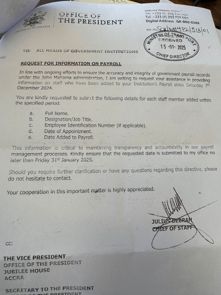 The Chief of Staff, Julius Debrah, in a formal communication addressed to all heads of government institutions, emphasized the importance of accurate payroll management as part of broader efforts to maintain fiscal responsibility and combat corruption within government operations. The directive comes in the wake of increasing scrutiny over public sector expenditures and the need for robust mechanisms to ensure that taxpayer money is utilized effectively.