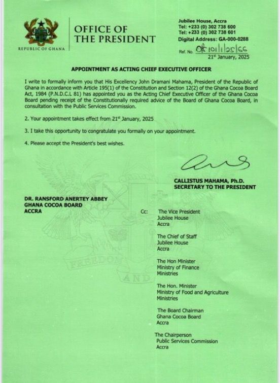 President John Dramani Mahama, President of the Republic of Ghana, has appointed Dr. Ransford Anerthey Abbey as the Acting Chief Executive Officer of the Ghana Cocoa Board.