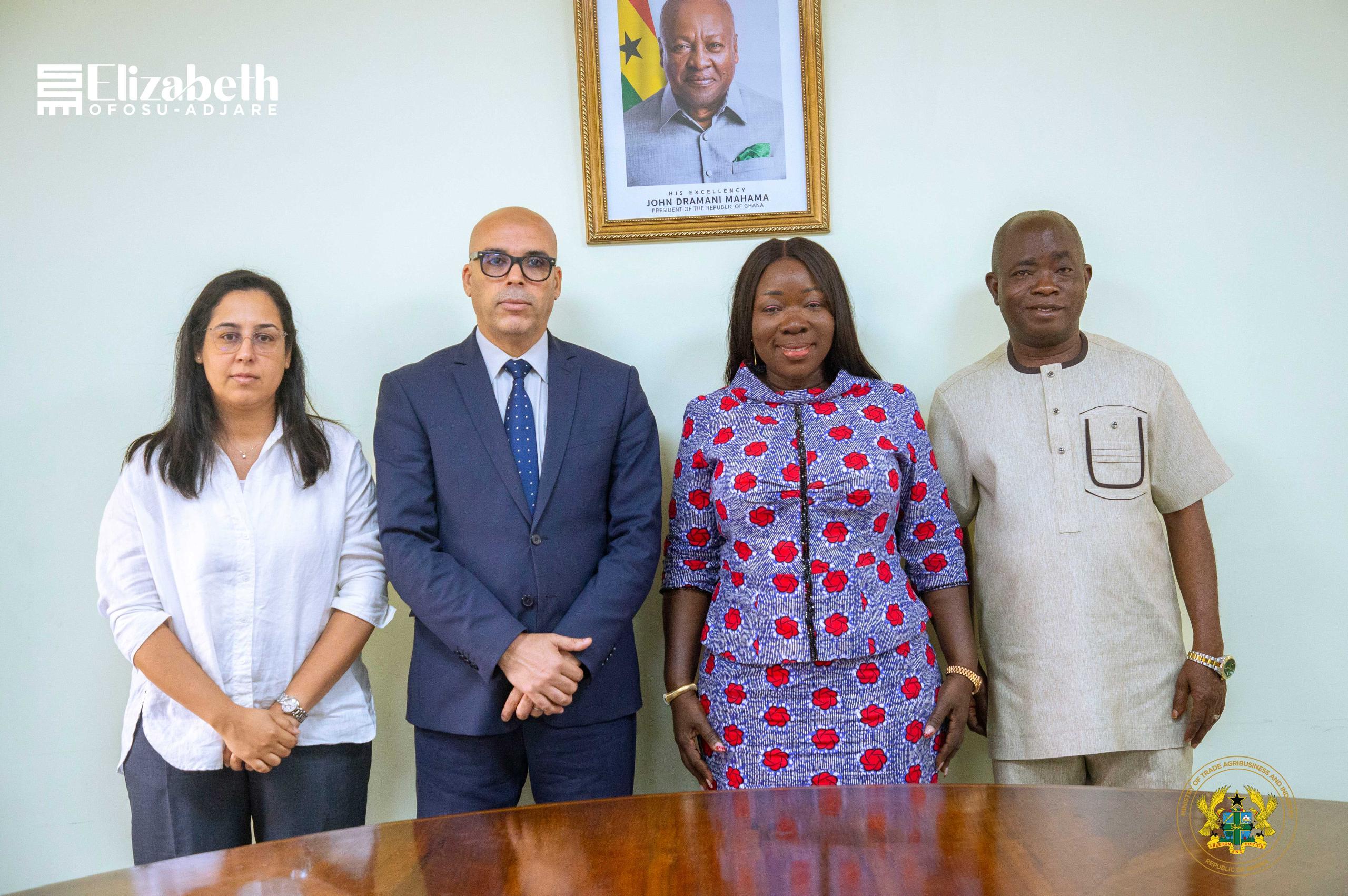 The Minister for Trade, Agribusiness and Industry, Hon. Elizabeth Ofosu-Adjare, on Tuesday, July 16, 2025, received a visiting delegation from the Kingdom of Morocco led by His Excellency Abderrahim Cherrab, Deputy Head of Mission at the Moroccan Embassy in Ghana, to explore opportunities for enhanced trade and agribusiness collaboration between the two nations.