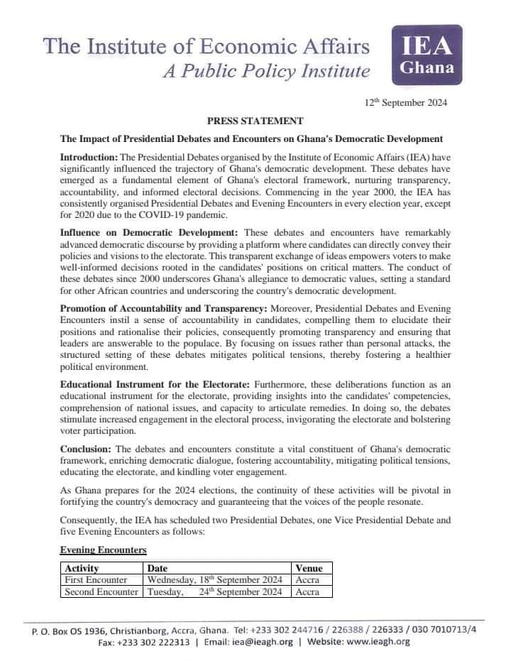 The Institute of Economic Affairs (IEA) has announced October 22 and November 19, 2024, for its first and second presidential debates respectively.