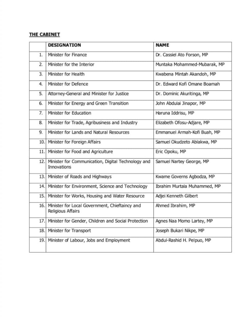 The rest are; the Minister for Communication, Digital Technology, and Innovation. Minister for Roads and Highways, Minister for Environment, Science, and Technology, Minister for Works, Housing, and Water Resources, Minister for Local Government, Chieftaincy, and Religious Affairs, Minister for Gender, Children, and Social Protection, Minister for Transport, and Minister for Labour, Jobs, and Employment
