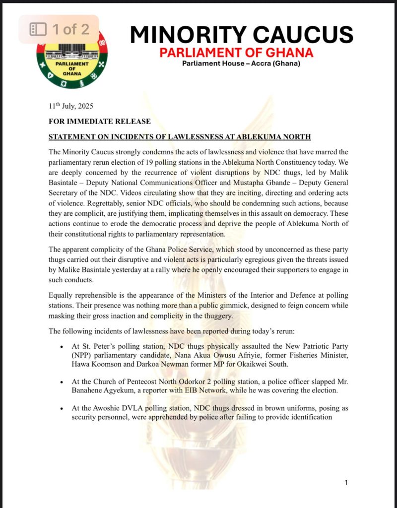 The Minority in Parliament has strongly condemned reported incidents of violence and disruptions that marred the parliamentary rerun election in 19 polling stations within the Ablekuma North Constituency on Friday, July 11, 2025.