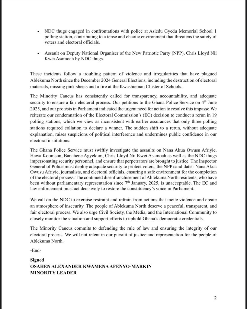 In a statement signed by the Minority Leader, Mr. Alexander Afenyo-Markin, the caucus expressed deep concern over what it described as a pattern of violent disturbances that continue to undermine the democratic process and deny residents of Ablekuma North their constitutional right to parliamentary representation.