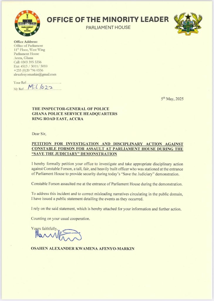 Member of Parliament for the Effutu Constituency and Minority Leader in Ghana’s Parliament, Alexander Kwamena Afenyo-Markin, has formally petitioned the Inspector-General of Police (IGP), Mr. Christian Tetteh Yohuno, to launch a full investigation into an alleged unprovoked act of violence against him by a uniformed police officer during the “Save the Judiciary” demonstration at Parliament House.