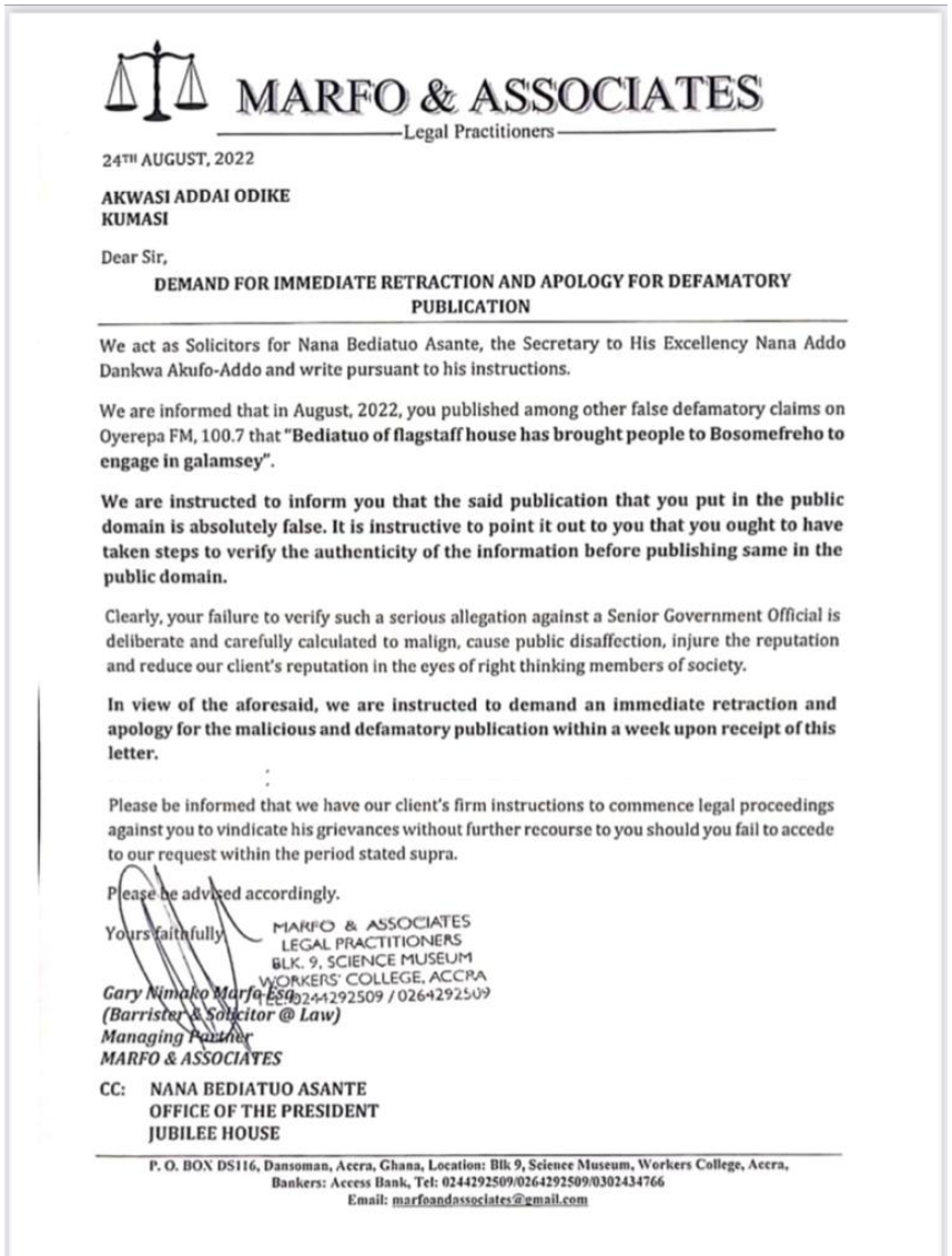 “We are informed that in August 2022, you published other false defamatory claims on Oyerepa FM, 100.7 that Bediatuo of Flagstaff House has brought people to Bosome Freho to engage in galamsey… We are instructed to inform you that the said publication that you put in the public domain is absolutely false”, the letter stated.