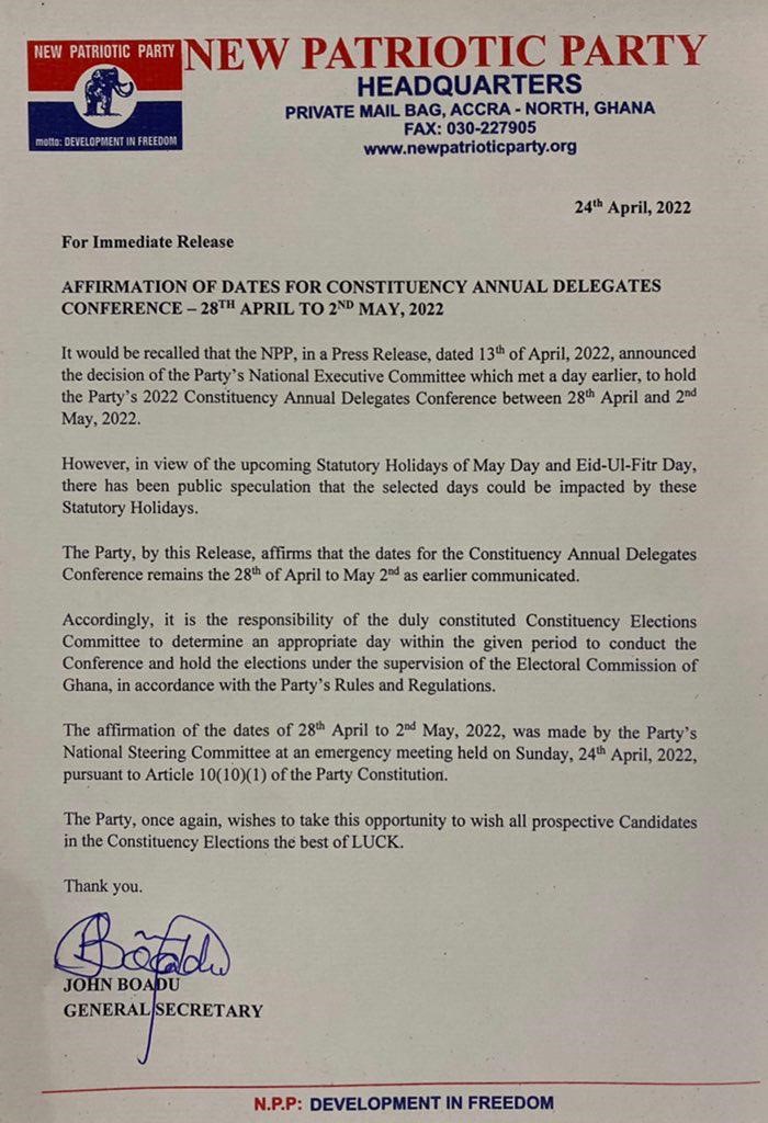 The statement thus entreated the Constituency Elections Committee to “determine the appropriate day within the given period to conduct the Conference and hold the elections under the supervision of the Electoral Commission of Ghana, in accordance with the party’s rules and regulations.”