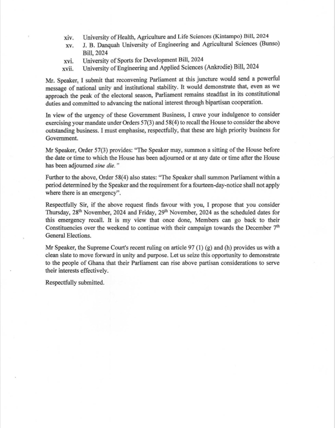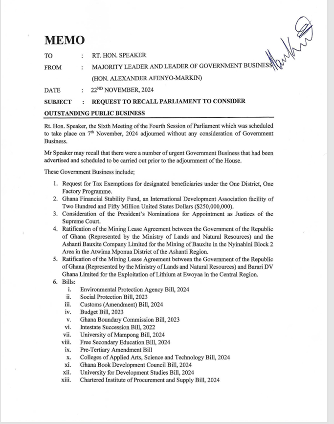 In a letter dated Friday, November 22, 2024, and signed by the Leader of the NPP group, Mr. Afenyo-Markin, urging the Speaker to reconvene Parliament for the third time, suggesting Thursday, November 28, and Friday, November 29, 2024, as suitable dates for the emergency recall.