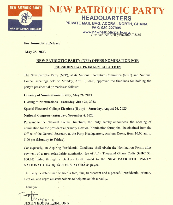 The New Patriotic Party (NPP) has opened nominations for its Presidential primaries to start tomorrow.