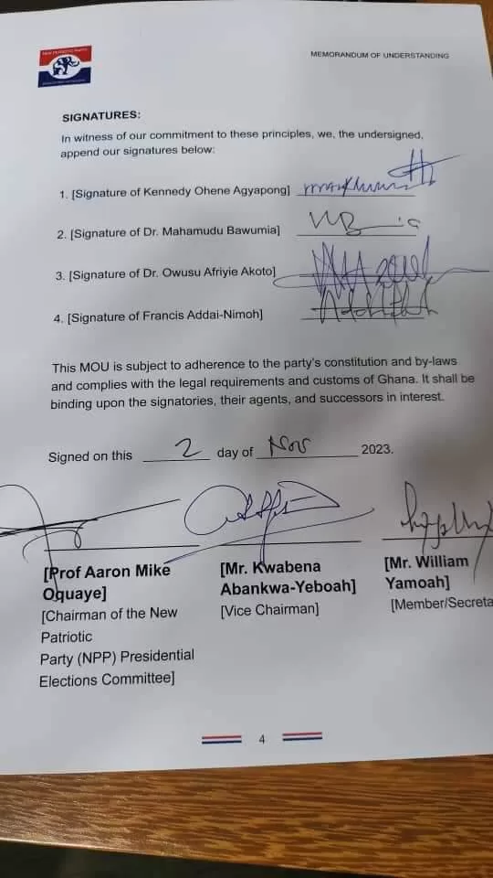 The four presidential aspirants participating in the New Patriotic Party (NPP) primary have signed an undertaking to accept the election results and refrain from resigning from the party in the event of defeat during the upcoming primary on Saturday.