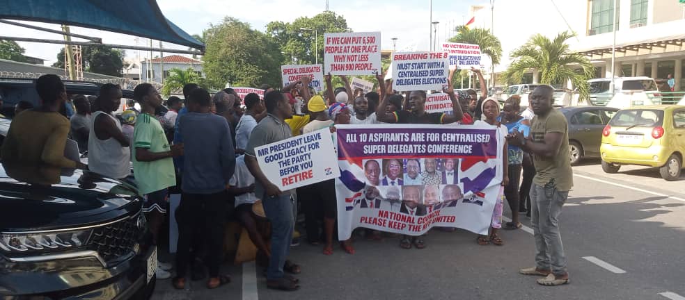 Some supporters of the governing NPP on July 20, 2023, massed up in front of the Alisa Hotel, in Accra where the National Executive Committee of the party was meeting to decide on whether or not to hold the Special College Election of the five flag bearer aspirants at a centralized venue or at the constituency or regional levels.