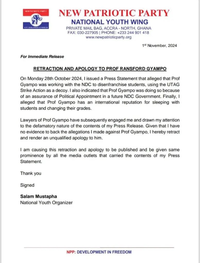 National Youth Organizer of the New Patriotic Party (NPP), Salam Mustapha, has issued a formal apology to Professor Ransford Gyampo for leveling unfounded allegations against him.