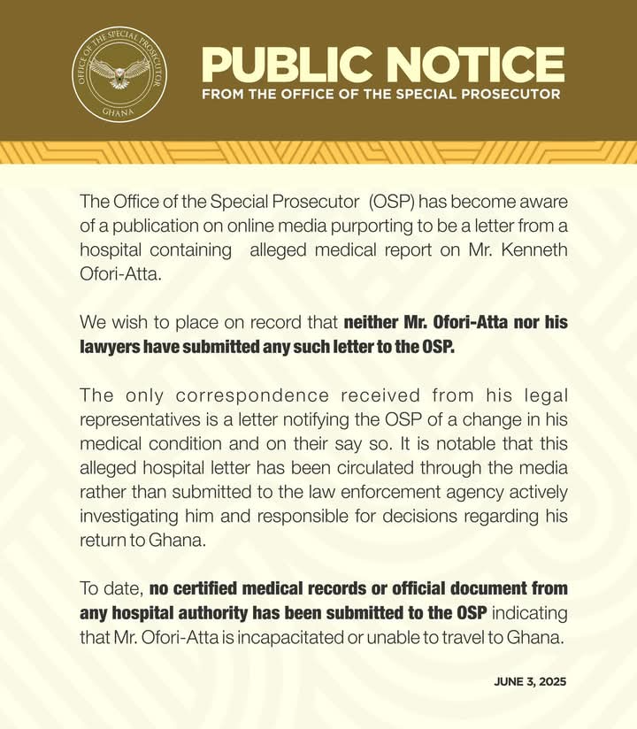 The Office of the Special Prosecutor (OSP) has issued a public notice denying claims that it has received a medical report on Mr. Kenneth Ofori-Atta, a former government official currently under investigation.