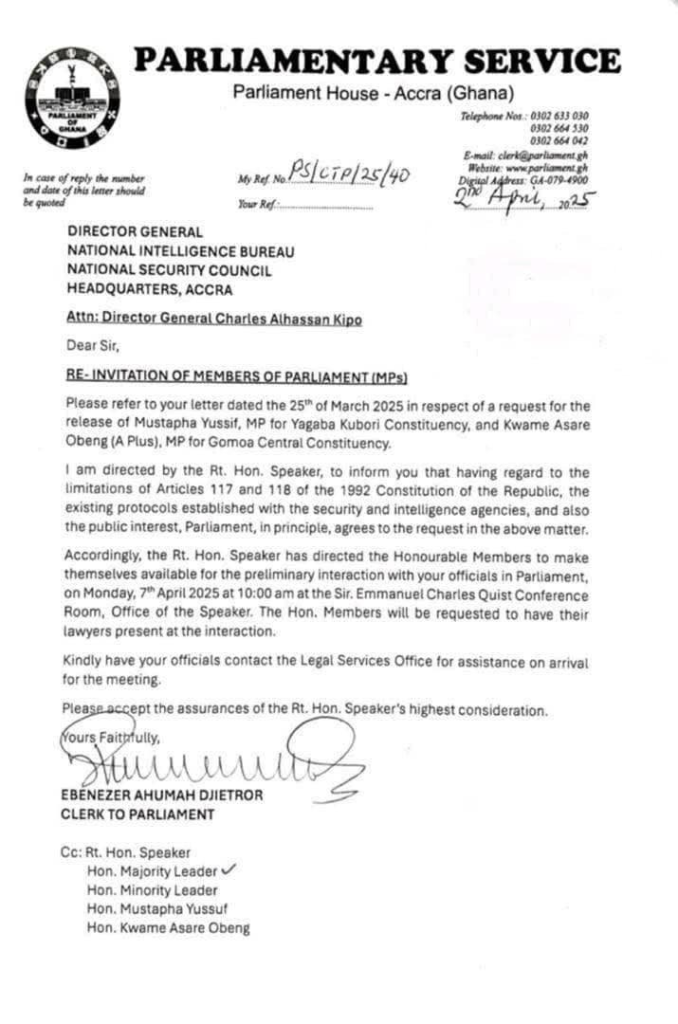 A letter dated April 2, 2025, and signed by Ebenezer Ahumah Djetor, Clerk to Parliament, addressed to the Director General of the NIB, Charles Alhassan Kipo, confirmed that Parliament has considered the request in line with Articles 117 and 118 of the 1992 Constitution of Ghana, which outline the privileges of MPs.