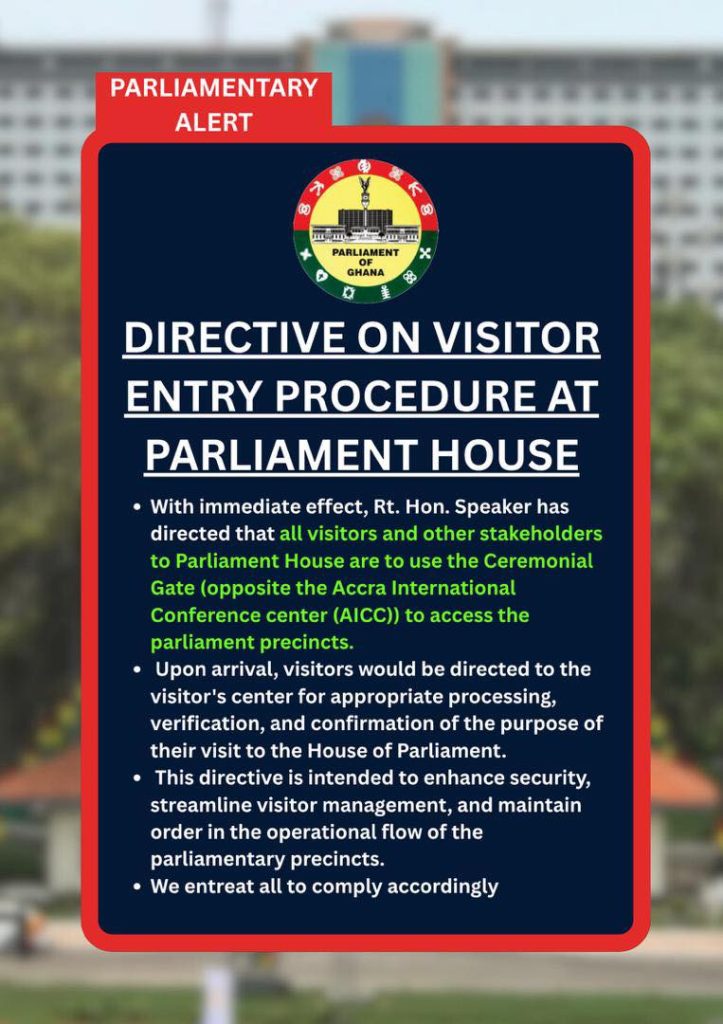 A statement issued on July 8, 2025 and signed by the Director of Media Relations, David Sebastian Damoah, explained that the new security protocols is aimed at improving safety, streamlining visitor management, and ensuring order within the precincts of Parliament House.