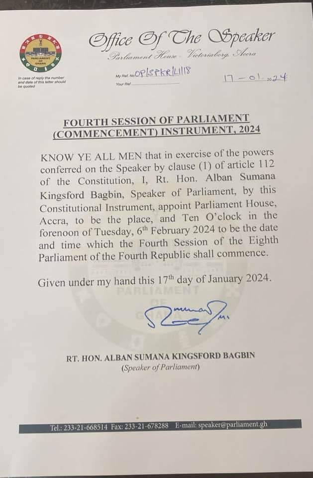 In a letter dated January 17, 2024, for the information of the members of Parliament and the public, the Speaker, Alban Sumana Kingsford Bagbin, said, “by this Constitutional Instrument, appoint Parliament House, Accra, to be the place, and Ten O’clock in the forenoon of Tuesday, 6th February 2024 to be the date and time which the Fourth Session of the Eighth Parliament of the Fourth Republic shall commence.”