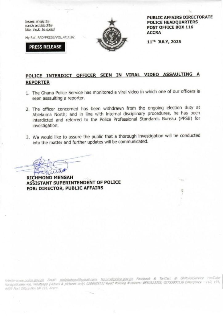 According to a press release signed by Assistant Superintendent of Police Richmond Mensah, the officer involved has been removed from election duty and placed under interdiction.