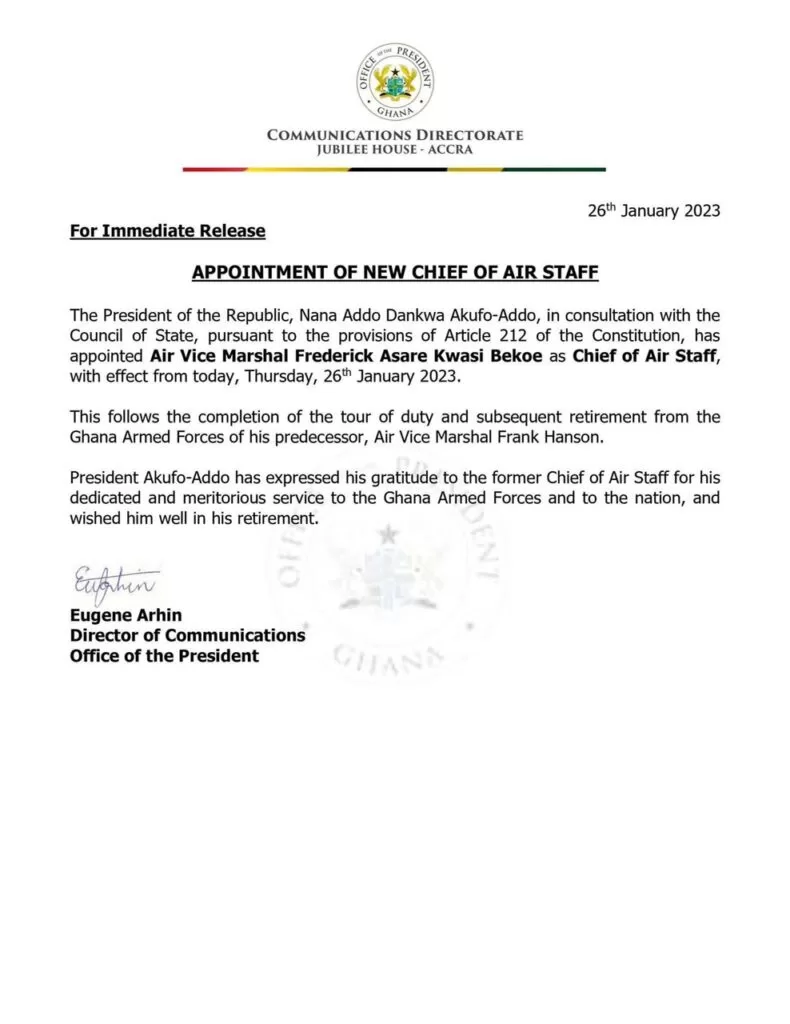President Akufo-Addo has appointed Air Vice Marshal Frederick Asare Kwasi Bekoe as the Chief of Air Staff.