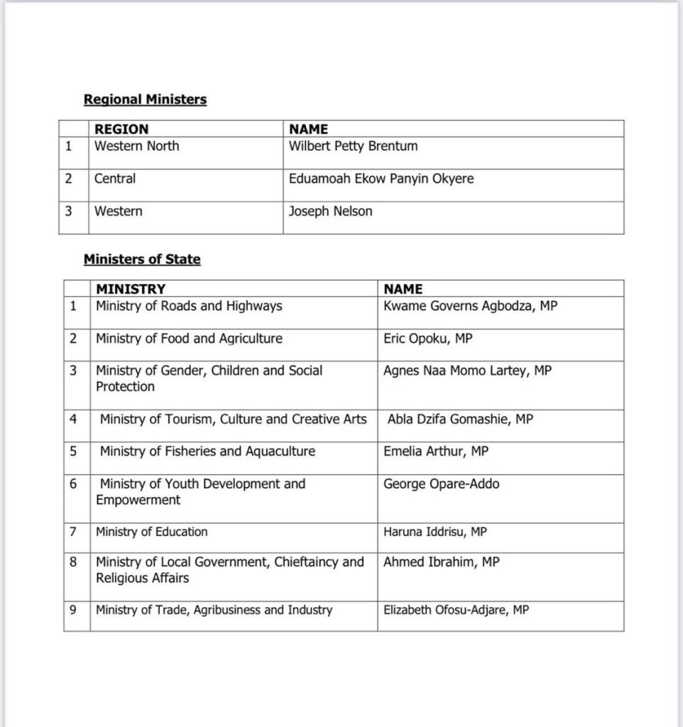 President John Dramani Mahama has submitted a list of ministerial nominees, including nine cabinet positions and three regional ministers to Parliament for approval.