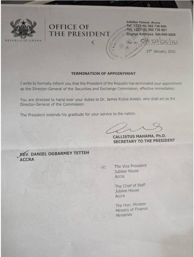 President John Dramani Mahama has removed Rev. Daniel Ogbarmey Tetteh from his position as Director-General of the Ghana Securities and Exchange Commission (SEC).