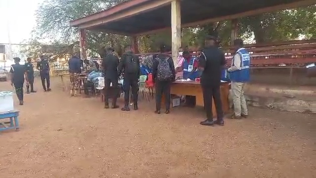 Political party agents are all present at the voting centre, with two police personnel stationed there to maintain calm and order.