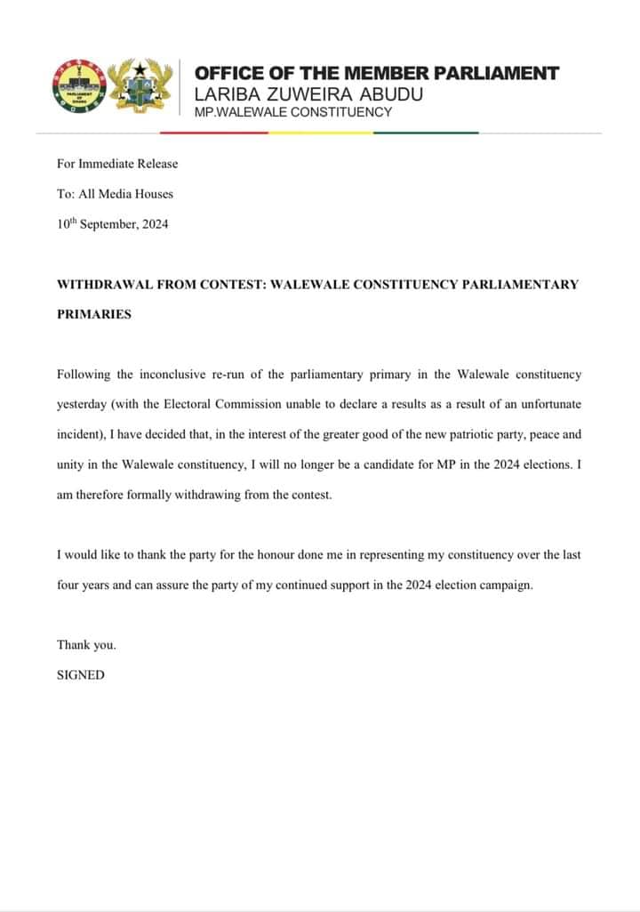 In a surprising turn of events, the Incumbent Member of Parliament for Walewale, representing the New Patriotic Party (NPP), Lariba Zuweira Abudu has announced her withdrawal from the 2024 parliamentary primaries.