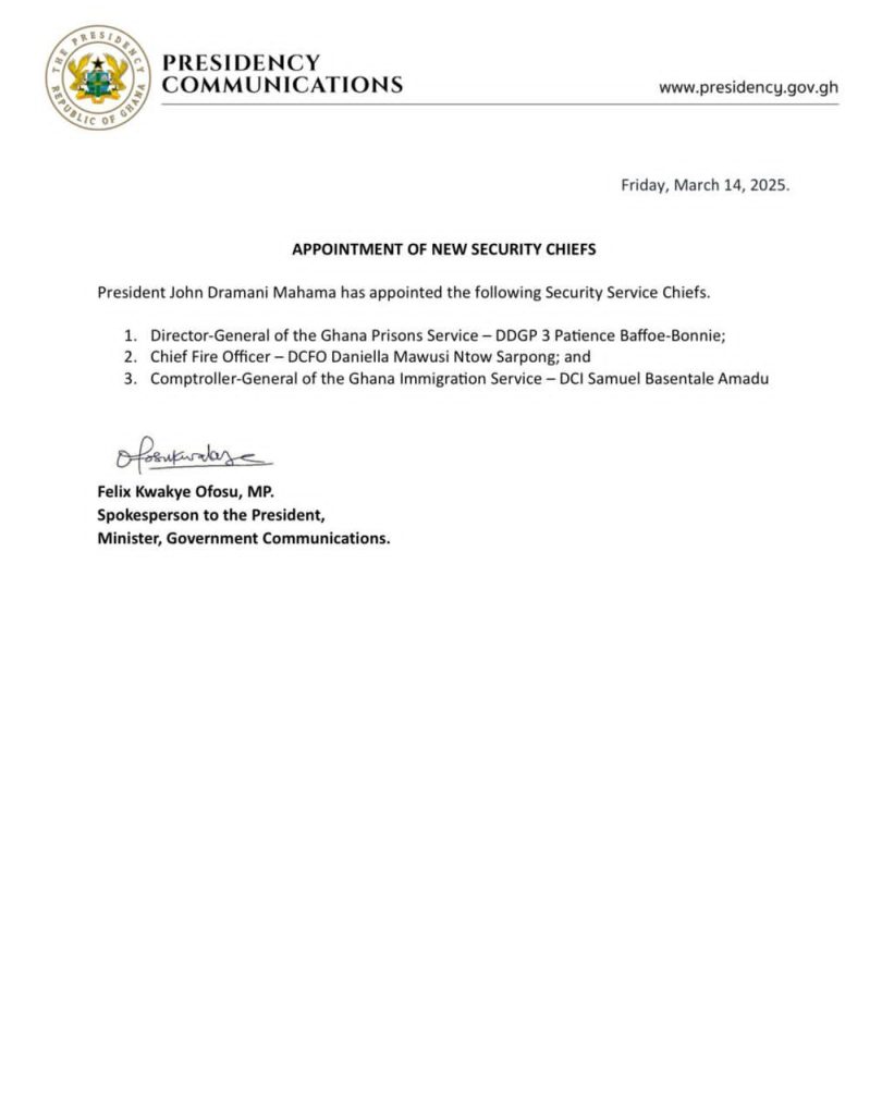 President John Dramani Mahama has appointed new security chiefs to oversee key institutions in Ghana.