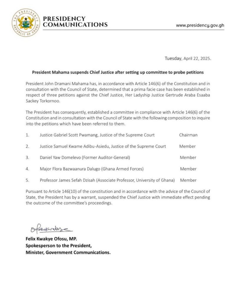 President John Dramani Mahama has officially constituted a five-member committee to investigate allegations made against Chief Justice Her Ladyship Justice Gertrude Araba Esaaba Sackey Torkornoo. This follows the establishment of a prima facie case after three separate petitions were filed, prompting the President to act in accordance with Article 146 of the 1992 Constitution.