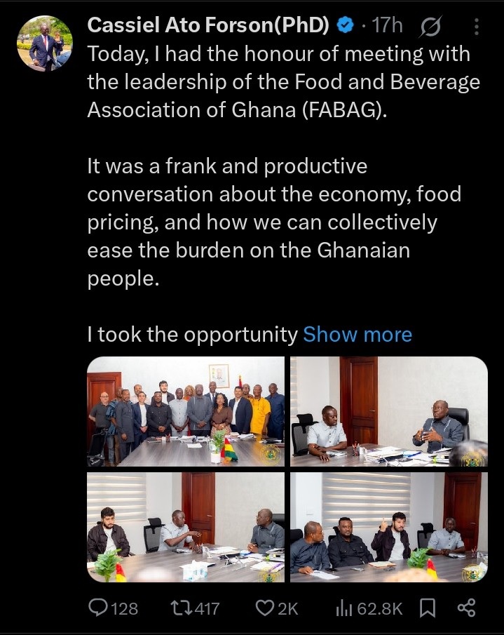 In a post on X (formerly Twitter), Dr. Forson said he met with the leadership of the Food and Beverage Association of Ghana (FABAG) to discuss the economy, food prices, and how to ease the financial burden on Ghanaians.