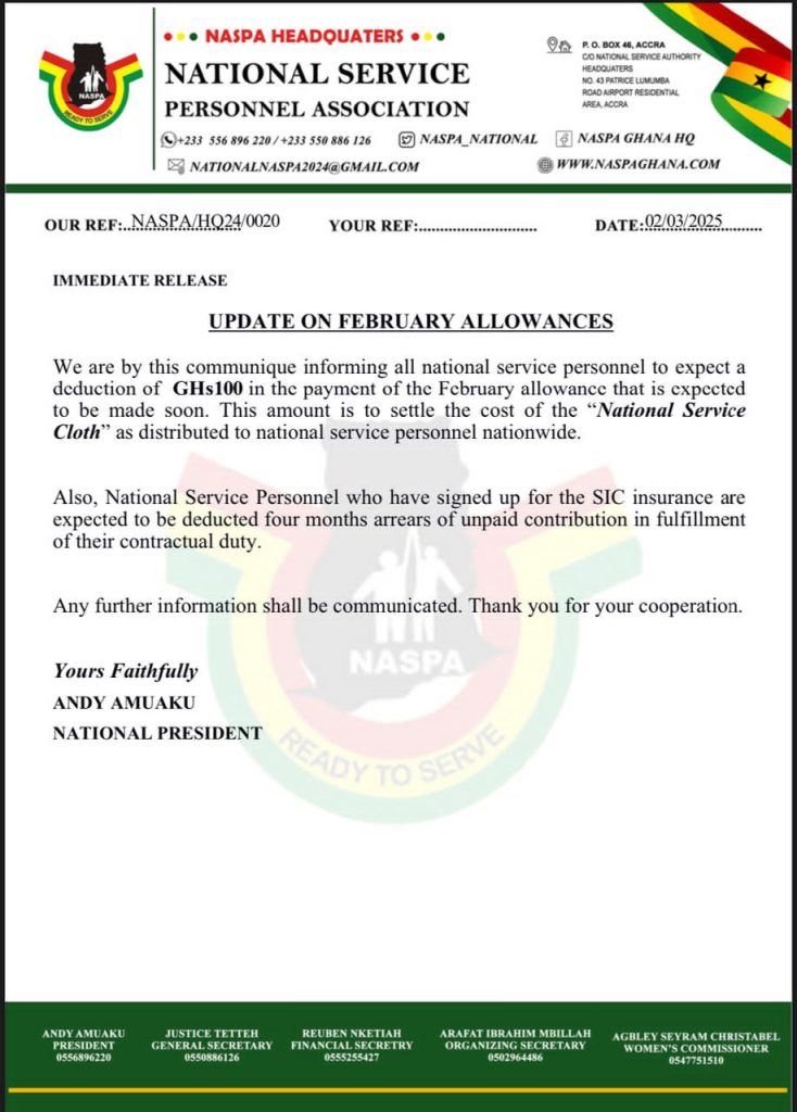 The National Service Personnel Association (NASPA) has announced that GH₵100 will be deducted from the February allowance of all national service personnel across Ghana.