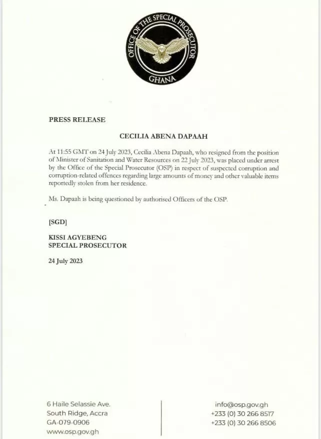 Former Ghanaian Sanitation and Water Resources Minister, Cecilia Abena Dapaah has been placed under arrest by the Office of the Special Prosecutor of Ghana pending some questioning by officers of the Special Prosecutor.