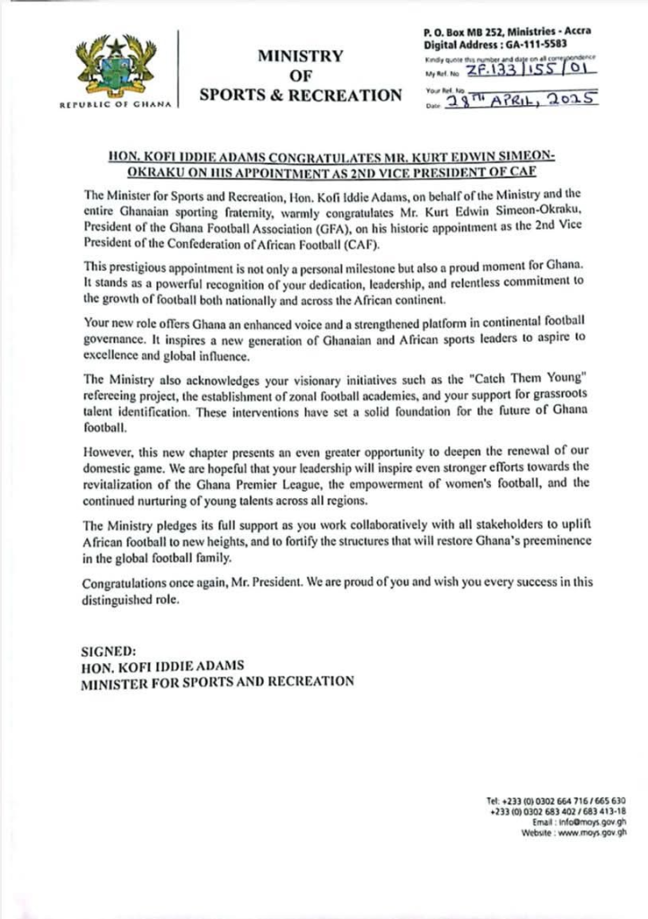 The Ministry pledged its full support to Okraku as he collaborates with stakeholders to elevate African football and restore Ghana’s prominence in the global football community. The statement concluded with heartfelt congratulations and well-wishes for his success in the esteemed role.